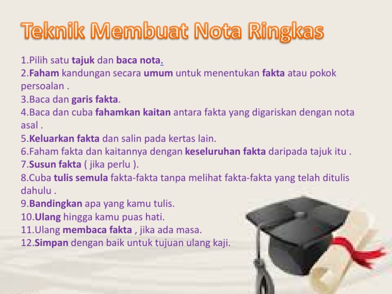Nota ringkas Teknik catat nota yang paling berkesan. Faham kandungan secara umum untuk menentukan fakta atau pokok persoalan. Selain tu korang mesti la buat dengan kemas dan teratur mengikut tajuk dan isi yang sesuai.